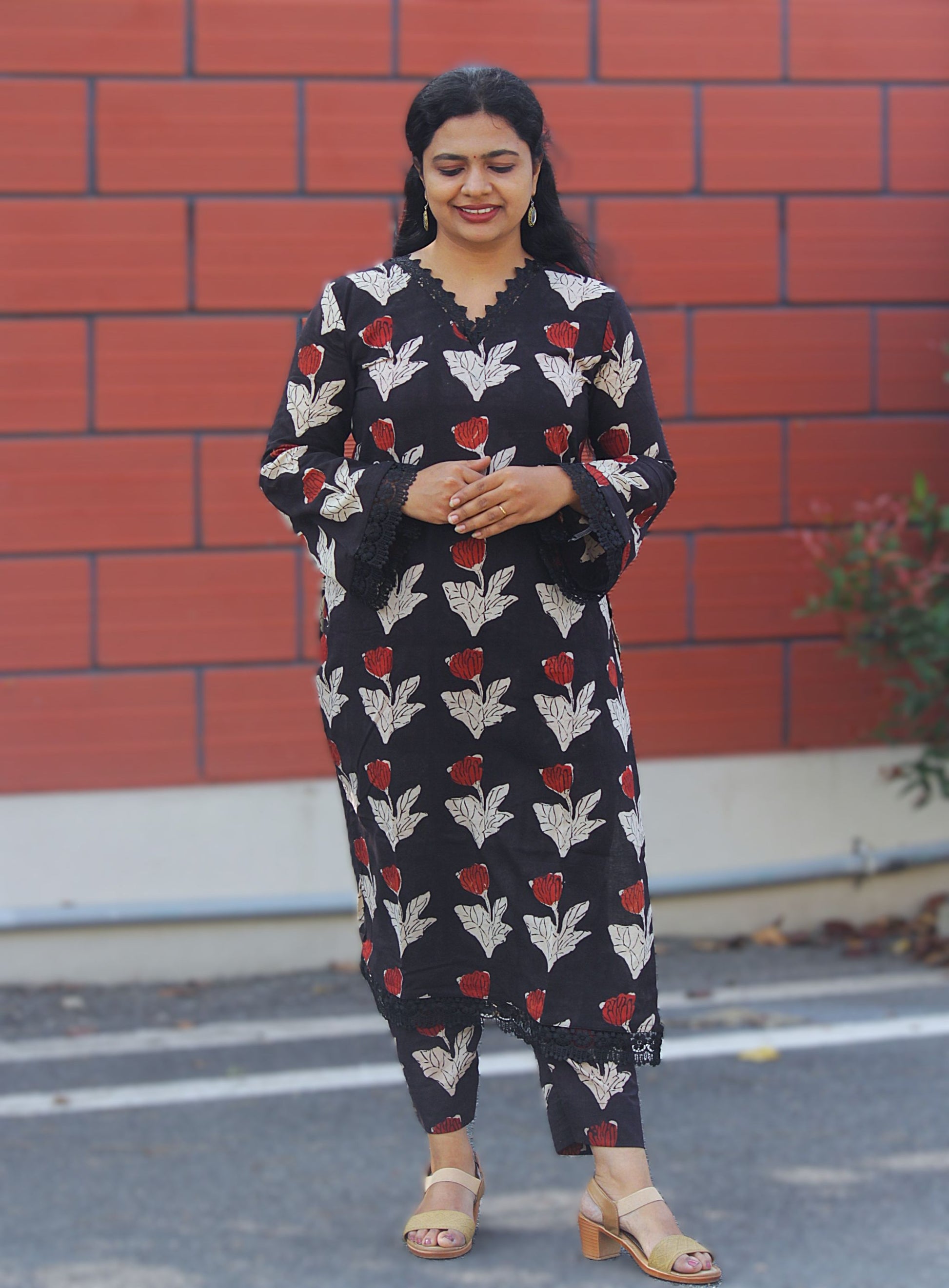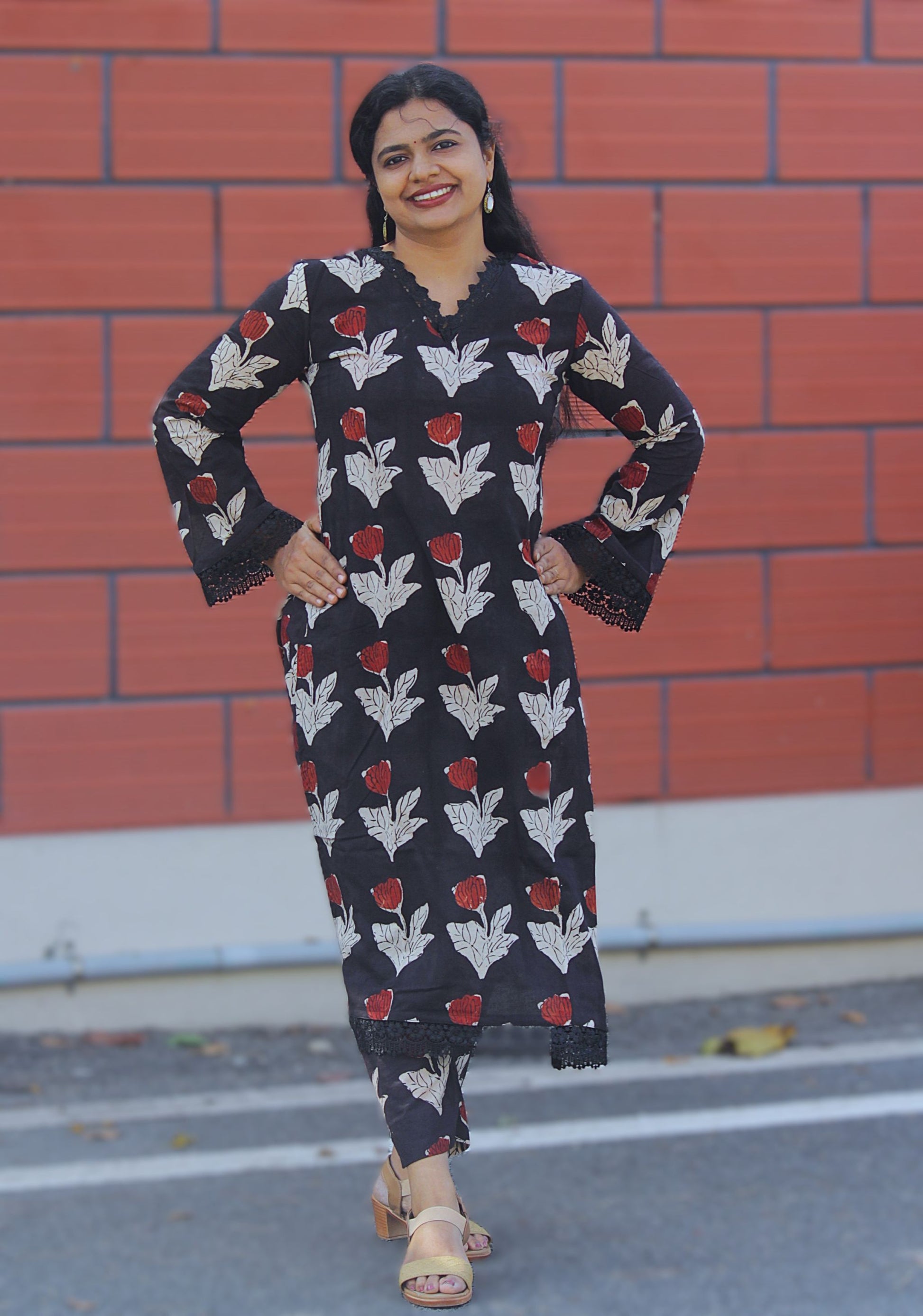 Lace detailing around V-Neck, Sleeve & bottom of the kurta